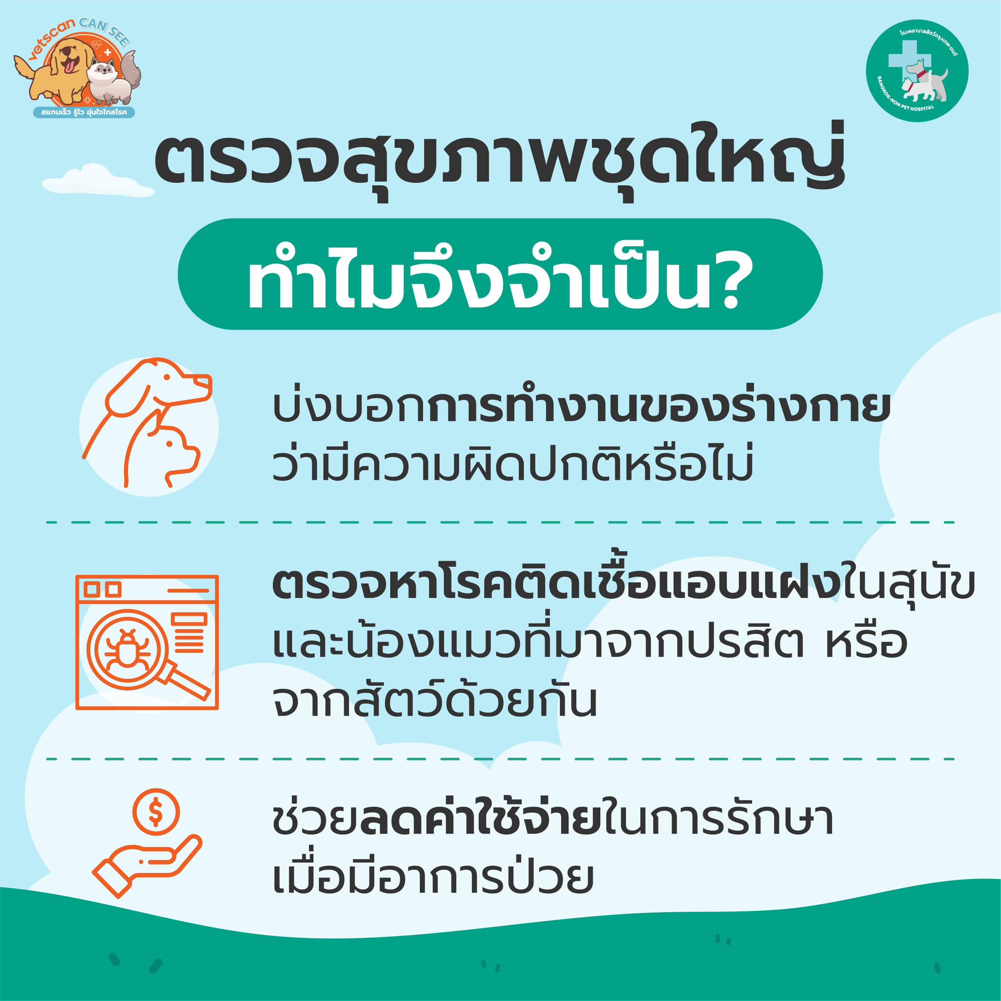 - การตรวจสุขภาพประจำปี (Annual Check-up) สำคัญที่สุด แม้สัตว์เลี้ยงจะดูแข็งแรงดี การตรวจร่างกาย, ชั่งน้ำหนัก, และฟังเสียงหัวใจ/ปอด ช่วยให้สัตวแพทย์พบความผิดปกติได้ตั้งแต่เนิ่นๆ